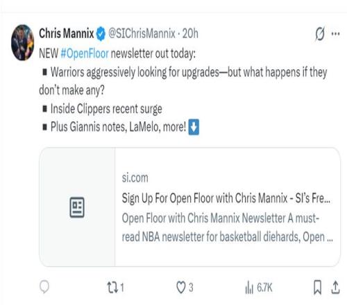 很明显克里斯-曼尼克斯、尼克-菲尔德都觉得勇士队应该放眼下赛季,除非扬尼斯真的要被交易,不然勇士队在这个交易截止日可以不去引援,勇士还让有交易价值的老将送走换取一些有价值的未来资产,在今夏休赛期再进行大规模的交易补强,让库里26-27赛季有希望去冲冠。